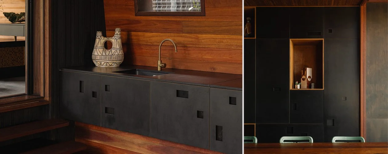 Designed and built by CplusC Architect + Builders, Paperock is used for cabinetry in the kitchen, living spaces and bedrooms with a signature pattern repeated across the surfaces. Photography: Michael Lassman