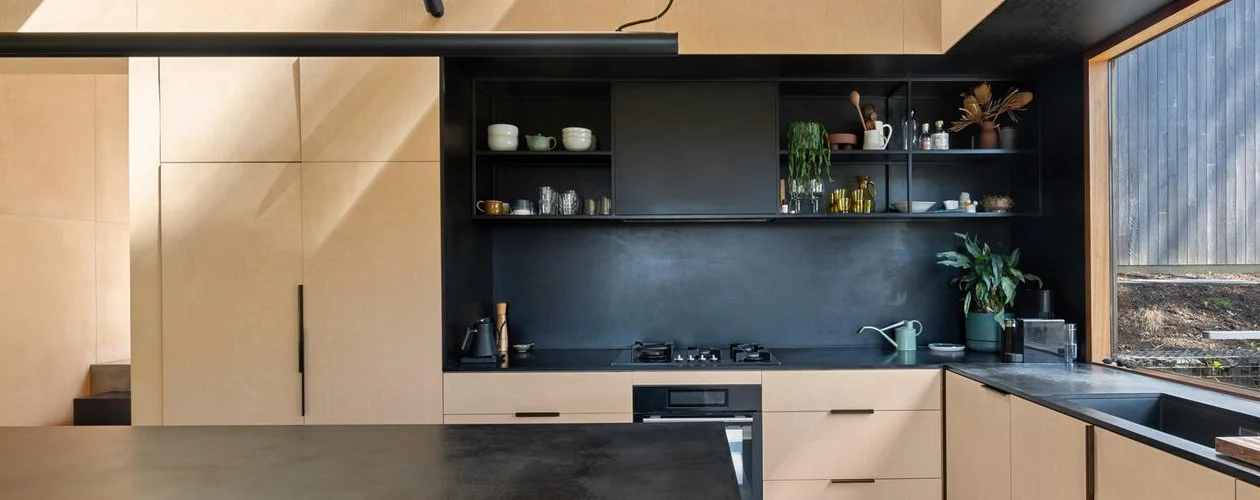 Paperock used as a splashback in the Two Halves House. Check out the Moloney Architects website for more fantastic photos of the house where Paperock SOLID is used for the kitchen benchtop and bathroom cabinetry. Joinery and photography by Woodbeast.